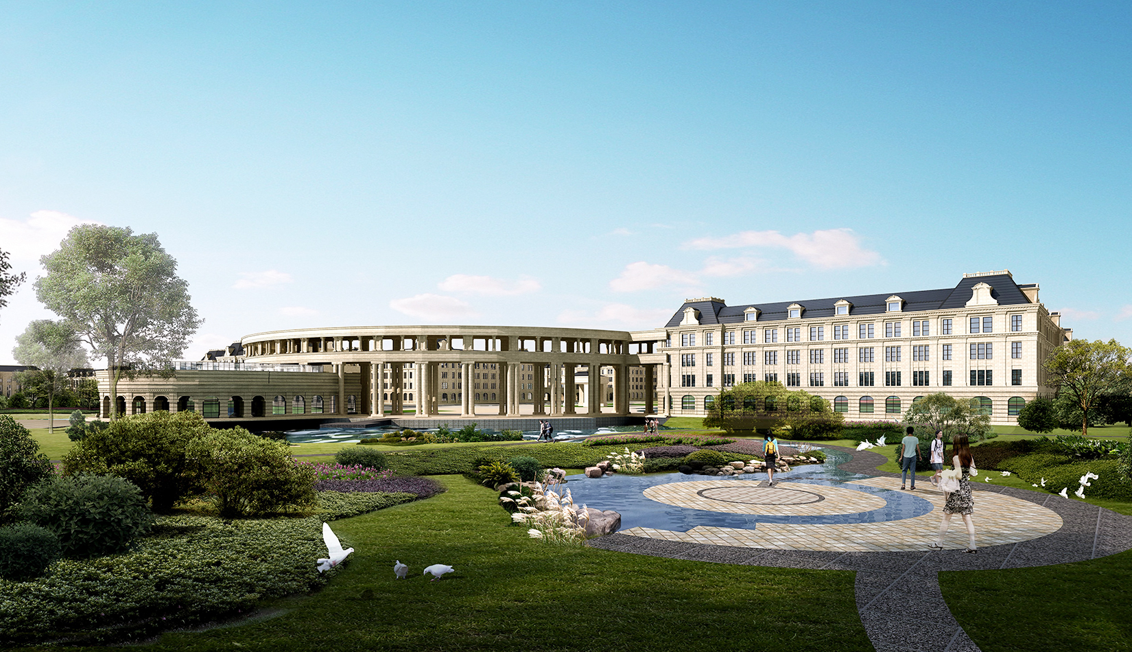 延續(xù)孫武湖的歷史文化內(nèi)涵打造校園內(nèi)部來(lái)自城市的自然水體。隨著校園內(nèi)部流淌著的潺潺湖水,仿佛流傳幾千年的孫武兵家文化在這里生根、延續(xù)